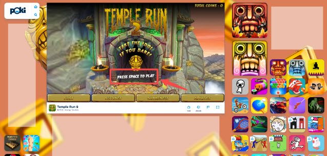 3、因为是在线游戏,所以游戏内容需要时间加载,加载所需时间会根据网络情况、网速不同而不同。加载完,游戏界面会出现提示怎么开始游戏,比如下图的神庙逃亡2“press space to play”(按空格来开始游戏)