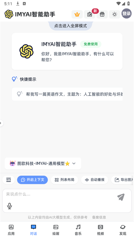1、IMYAI智能助手是一款集成了多种智能功能的在线服务平台,为用户提供聊天对话、文本处理、专业绘画、音乐创作、视频创作等多元化服务。