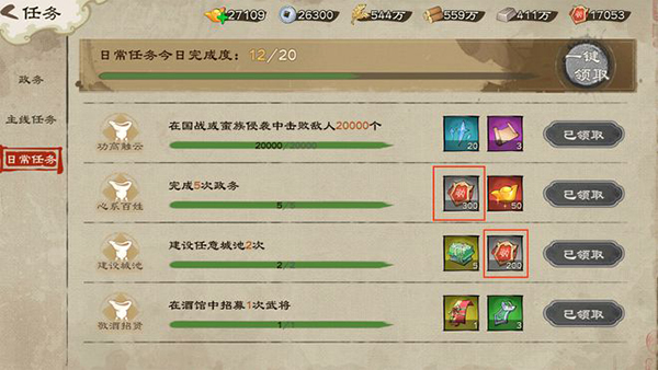 完成政务可获得功勋奖励。政务每日可免费做5次,可购买3次。