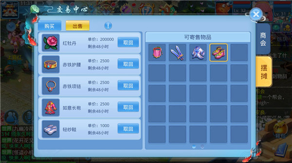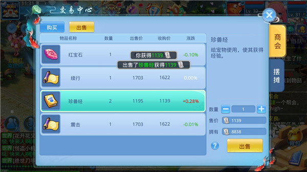 5、交易中心出售道具----平时获得的银票道具出售给系统,获得银票。