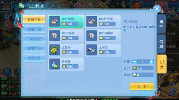 3、积分兑换----不管是分解道具材料、行侠仗义、竞技场、群雄逐鹿、门派任务等活动,都可以获得积分奖励,在人物积分兑换界面可以兑换银两,日积夜累积分是很多的。
