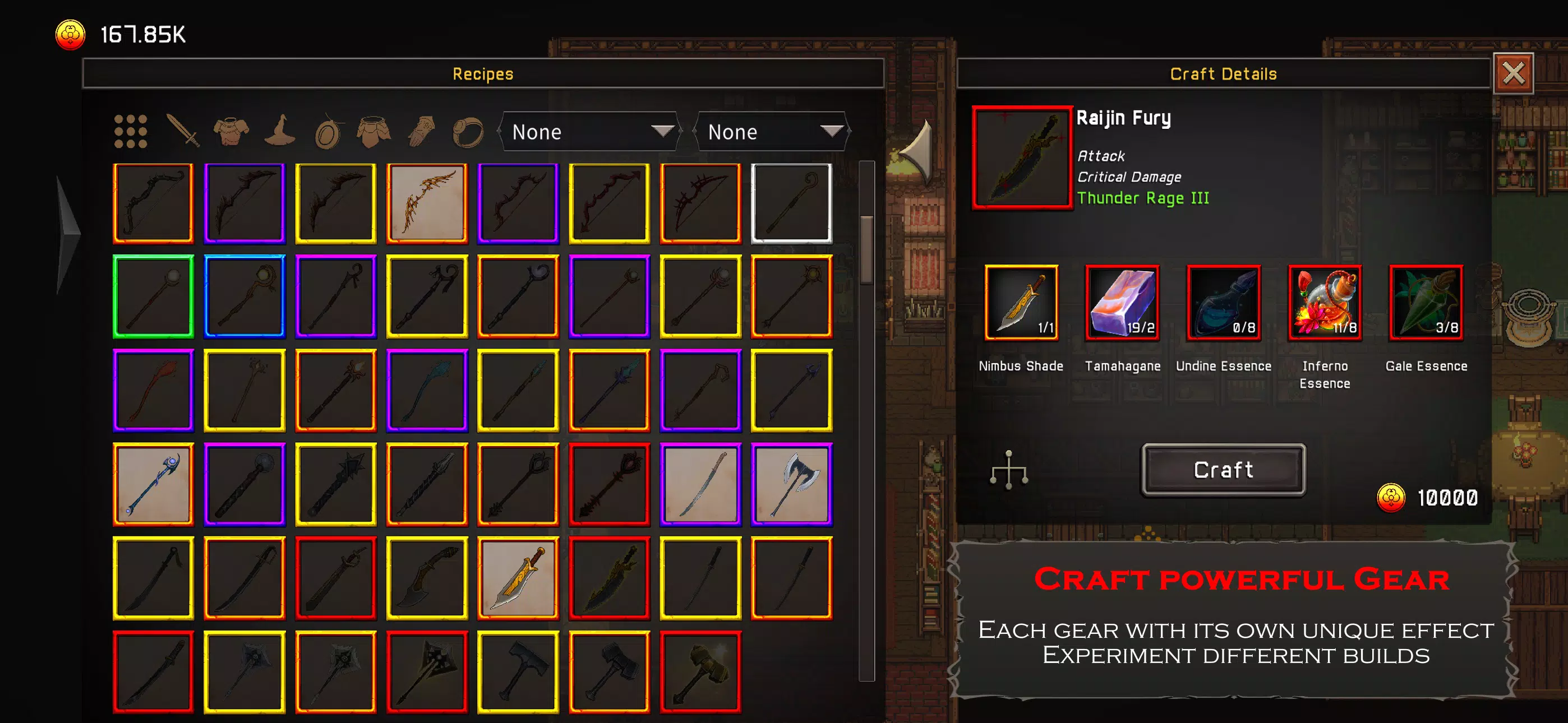 可制造武器、盔甲和神器提升属性,且每件装备有独特能力,丰富装备搭配。